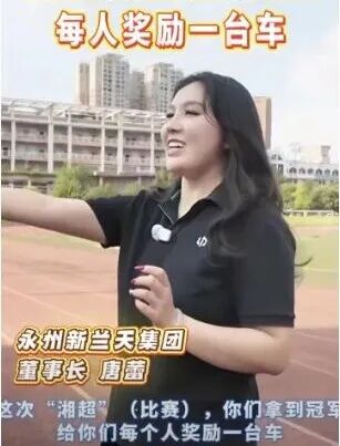 据媒体此前报道,2025年12月27日,湖南“湘超”联赛落幕,永州队爆冷夺冠。2025年8月,永州新兰天集团董事长唐蕾喊话永州队:“这次‘’,你们拿到冠军,给你们每人奖励一台车!”随后,球员们高呼:谢谢榜一姐姐!此后,唐蕾在其个人账号也曾表示“永州队夺冠送不送车?我的答案是:会送!”